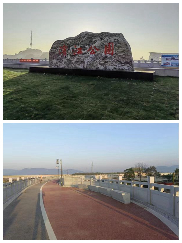 昔日因防洪墻改造而搬遷的公司舊址已變成濱江公園,現(xiàn)已成為小城一道亮麗的風(fēng)景!盀I江公園”四個(gè)紅色的大字,蒼勁有力,深深印在有底座的巨石之上,在小城的晨光里熠熠生輝,象征小城百折不撓精神的靈璧石,似牛似象,撫慰心靈。各種名貴的樹(shù)木、景觀石、兒童游樂(lè)場(chǎng)鑲嵌其中,各種健身器材呈圓形分布開(kāi),健身過(guò)后還可登上防洪墻,寬大的墻體頂部由紅、黑兩色鋪成的瀝青路面,可滿足不同游客的需求(慢跑和競(jìng)走),百十米就有石凳靜候、亭臺(tái)守望。如果沒(méi)有波光粼粼的長(zhǎng)河相伴,你會(huì)以為在步履“長(zhǎng)城”。