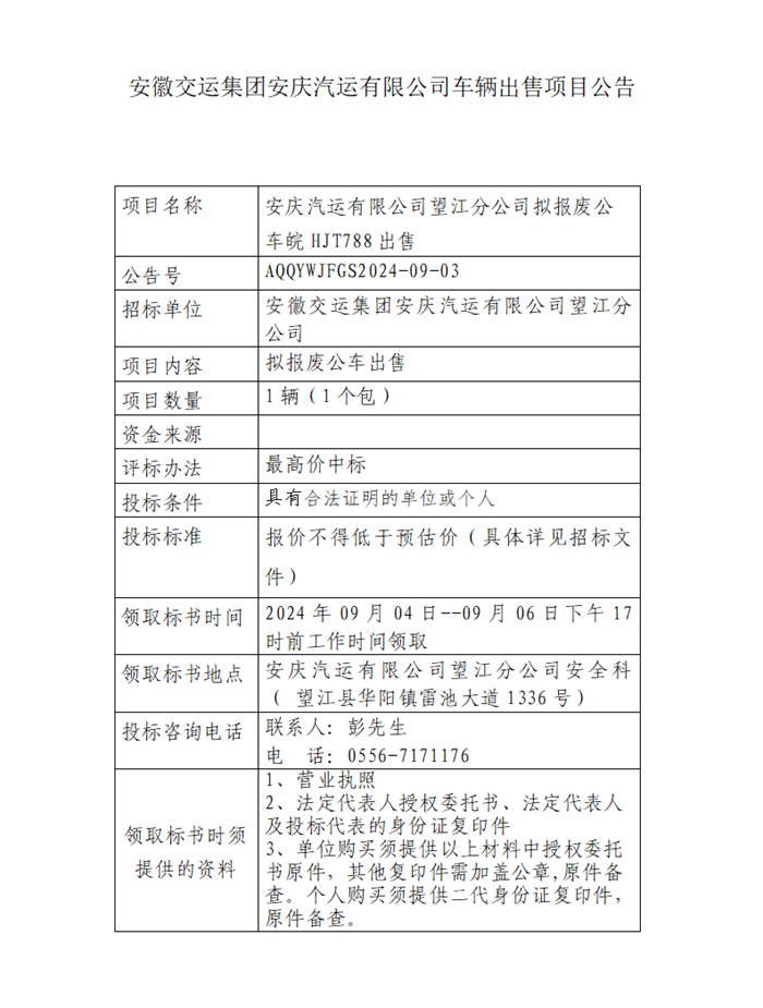望江分公司擬報(bào)廢公車(chē)皖HJT788出售項(xiàng)目公告